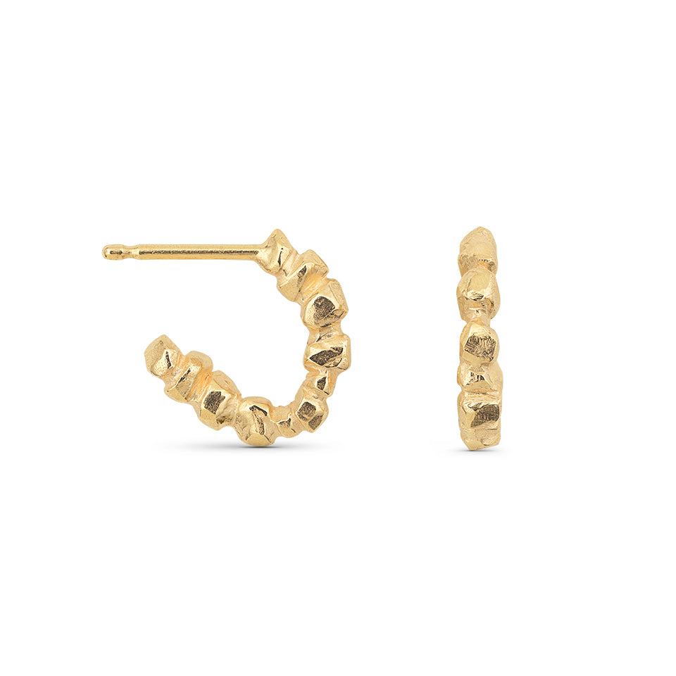 This huggie in 18 karat recycled gold is a small, versatile hoop earring that sits snugly around your earlobe. Layer it with a larger Gold Nugget Hoop or a Gold Nugget Stud Earring for that perfect curated look.